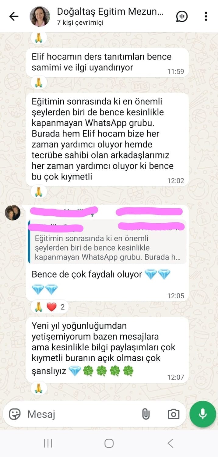 Siz eğitimi alınca sizi eğitim whatsap grubuma ekliyorum. Burası destek hattımız olarak faaliyet göstermektedir. Ve hiçbir zaman destek hattımız kapanmamaktadır. Bana da dilediğiniz zaman ulaşabilirsiniz. Hala ilk öğrencilerimle bile görüşürüm. Öğrencilerim benim için çok değerlidir.